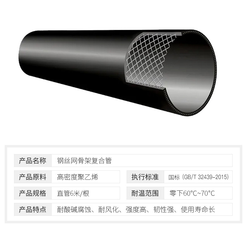 可以通過改變鋼絲直徑、網(wǎng)間距、塑料層厚度、塑料和種類來調(diào)整產(chǎn)品的結(jié)構(gòu)與性能,以滿足不同的耐壓、耐溫、防腐要求。